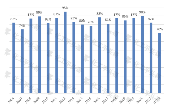 Abbildung 1 Jährliche Änderungen der Betriebsrate von Epoxidpropan in China